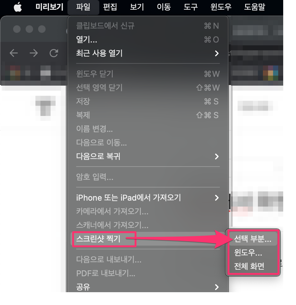 - 앱에서 직접 스크린샷 캡쳐하기: 미리보기 앱 > 파일 > 스크린샷 찍기 > 선택 부분, 윈도우, 전체화면 중 택1