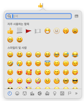 Mac에서 이모지 창은 아래와 같이 나오게 되고, 자주 사용하는 항목 혹은 카테고리별로 준비된 이모지를 선택하면 된다.
