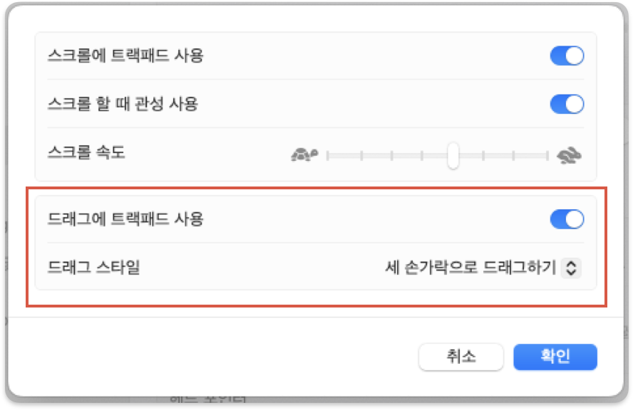 Mac에서 트랙패드 드래그 설정 방법 (세손가락으로 윈도우 드래그하기)