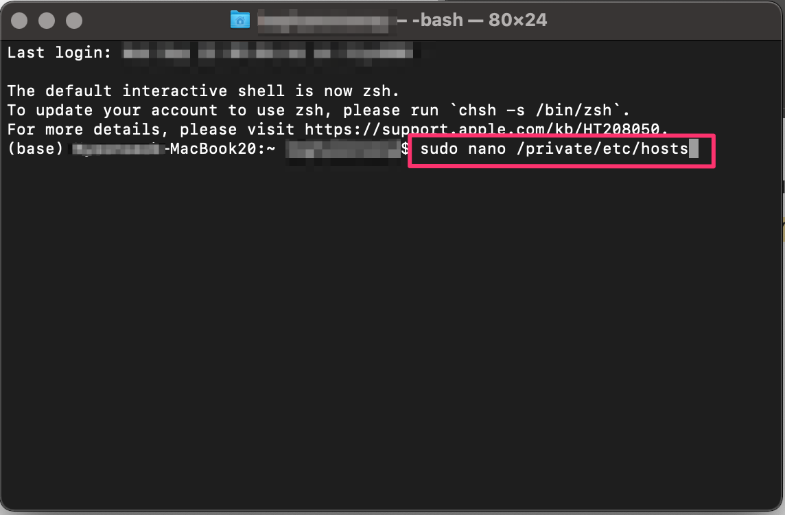 터미널 창에서 sudo nano /private/etc/hosts 명령어를 입력 후 엔터, 비밀번호 물어보면 입력 후 엔터 - hosts 파일의 내용 수정 후 종료 : host파일이 뜨면 IP주소와 도메인 정보를 입력한 뒤,